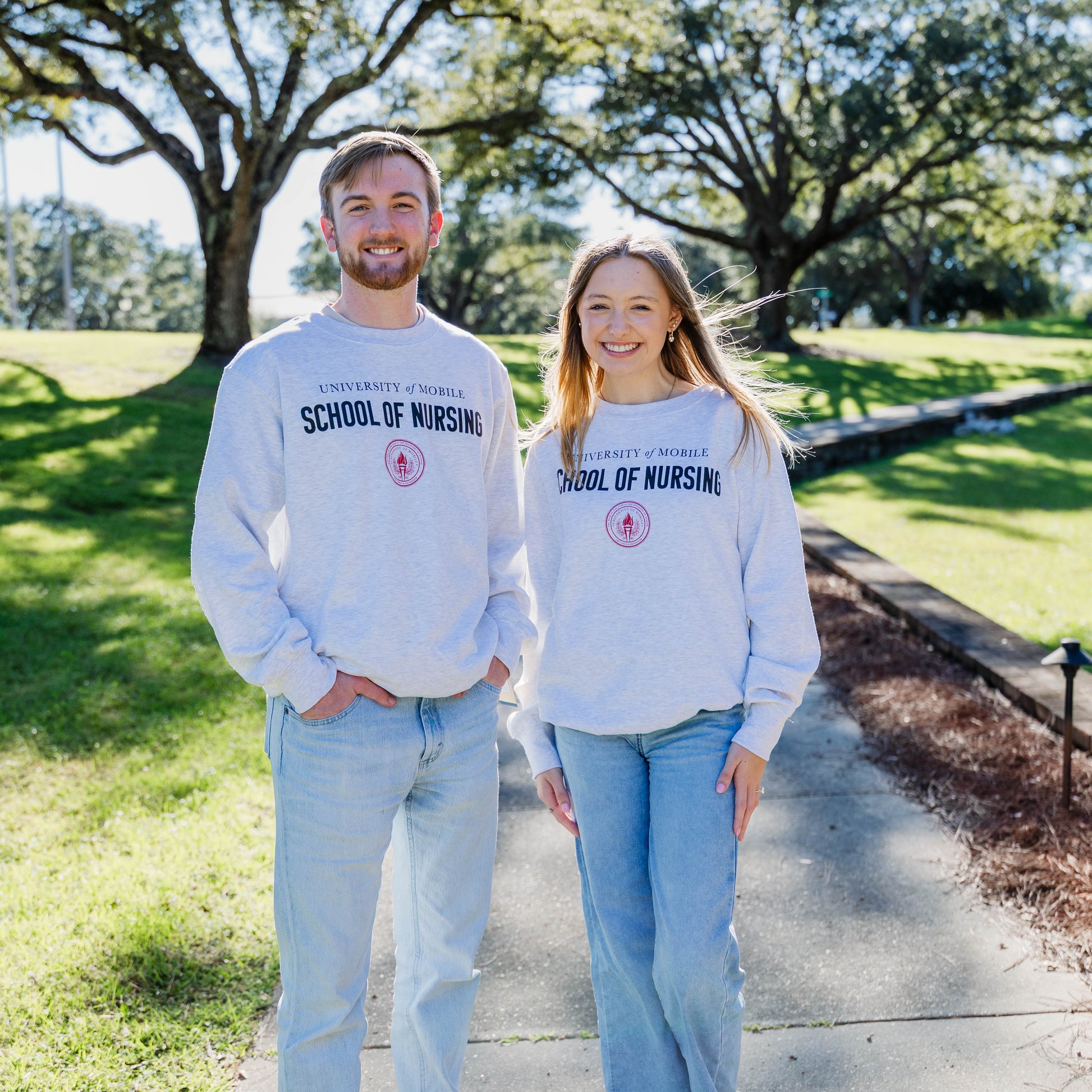 Soft, comfortable class fit in a fundamental fleece crew. 60/40 cotton/poly fleece with rib knit neck trim, cuffs and waistband. Color: Ash with black and ram red UM School of Nursing design.
